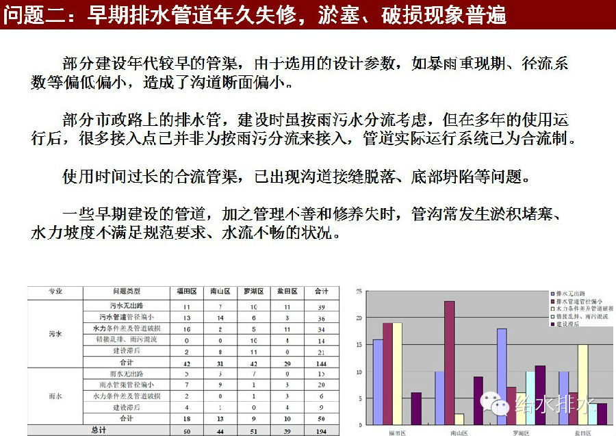 像濱海城市的河網(wǎng)地帶,一般是受地勢低洼且洪潮外包的雙重影響較大。后海這一塊規(guī)劃面積接近12平方公里,其中填海區(qū)5.9平方公里。在沒有填海之前,這一片是有8條排水明渠排入深圳灣,這一塊雨水設(shè)計(jì)的重現(xiàn)期基本上是一年一遇,2004年之前總體運(yùn)行情況是比較正常的。從填海開始之后,這一區(qū)域的內(nèi)澇問題就非常突出。而且受后海灣河塘淤積的影響,整個(gè)排水管渠的排水能力也有所降低。從表里可以看出來,常年淤積,有的地方達(dá)到了1米,最多達(dá)到了1.14米。由于這些突出問題,水面壅高,排水出路不暢,路排口的淤堵嚴(yán)重。