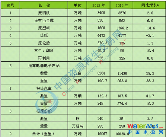 截止到2013年底,我國廢鋼鐵、廢有色金屬、廢塑料、廢輪胎、廢紙、廢棄電器電子產(chǎn)品、報(bào)廢汽車、報(bào)廢船舶等八大類別的主要再生資源回收總量約為1.60億噸,同比下降0.2%。其中,降幅最大的是廢塑料,同比下降14.6%;增幅最大的廢棄電器電子產(chǎn)品,同比增長38.3%。