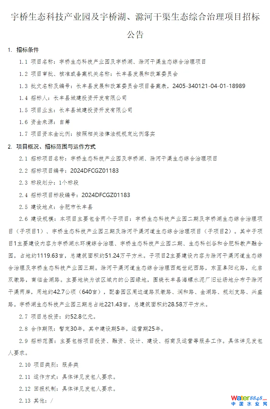 北極星環(huán)保網(wǎng)獲悉,6月5日,安徽宇橋生態(tài)科技產(chǎn)業(yè)園及宇橋湖、滁河干渠生態(tài)綜合治理項目公開招標,總投資52.8億元,招標人長豐縣城建投資開發(fā)有限公司。