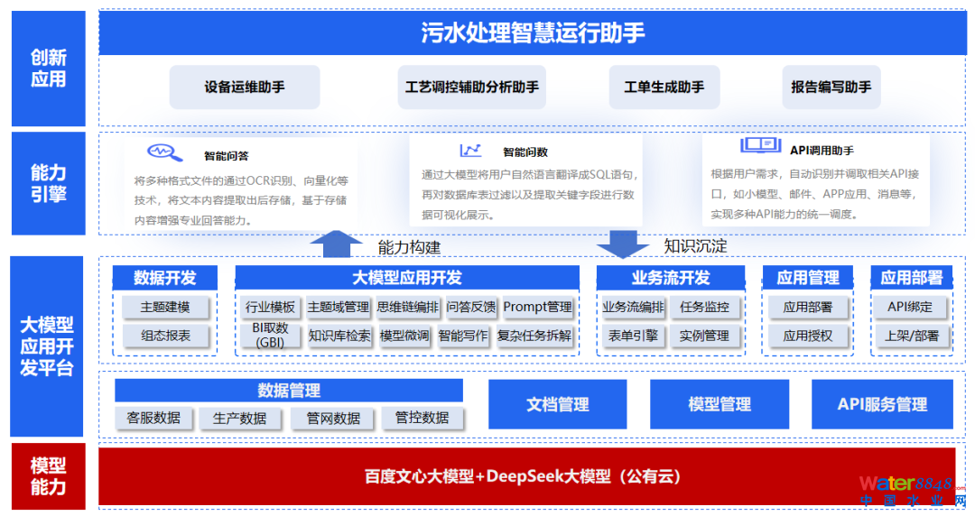 基于通用大模型的智慧運(yùn)行助手。采用通用大模型(LLM模型)建立智慧運(yùn)行助手,形成一個(gè)虛擬的“全能型”污水處理技術(shù)人員,可為工藝人員提供工藝調(diào)控優(yōu)化建議,為設(shè)備管理人員和安全管理人員提供精準(zhǔn)的專業(yè)知識。