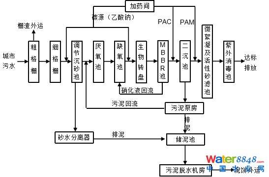 1、背景 平陰縣第三污水處理廠污水處理采用“一級處理+生物轉(zhuǎn)盤+MBBR池+活性砂濾池+紫外消毒”的處理工藝,污泥處理采用帶式濃縮脫水一體機(jī)處理,根據(jù)工程實(shí)施規(guī)劃,平陰縣第三污水處理廠總規(guī)模為600
