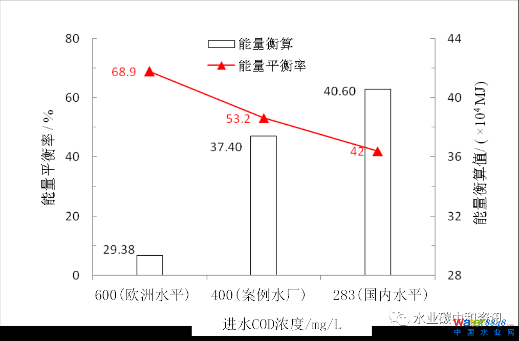 另外,從所構建的模型來看,污泥厭氧消化回收污水中有機物能量的多寡完全取決于進水中的有機物濃度,即進水COD濃度越高,可回收的有機物能量潛力便越大。繼而我們利用所構建模型針對不同的進水COD濃度進行了能量核算,結果如圖3所示。在我國污水處理廠平均進水COD濃度水平(283 mg/L),通過污泥厭氧消化能量回收只能實現(xiàn)約42%的能量平衡率;而當進水COD濃度增至600 mg/L時(歐洲平均水平),則回收的能量可以補償總能耗的68.9%。
