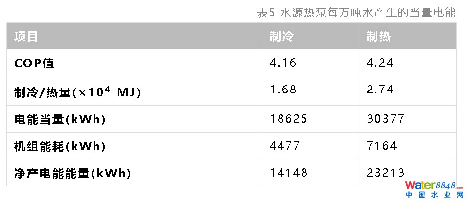 通過計算可知(表5),水源熱泵系統(tǒng)每利用1萬噸二級出水的制冷量和制熱量分別為1.68×105 MJ和2.74 MJ,考慮水源熱泵機組自身能耗(通過COP定義得出),則二級出水在夏季和冬季凈產能當量分別為14148 kWh/萬m3和23213 kWh/萬m3。由此可知,污水中的熱能是污水廠最大的能量“家底”。據(jù)此匡算,案例污水廠每天僅利用8萬噸二級出水(即13.3%的出水量)作為污水源熱泵的冷、熱源,就可滿足污水廠運行能耗的51%(制冷)和83.6%(制熱)。加上上述提及的污泥厭氧消化和太陽能回收,案例污水廠已可實現(xiàn)“能量平衡”。