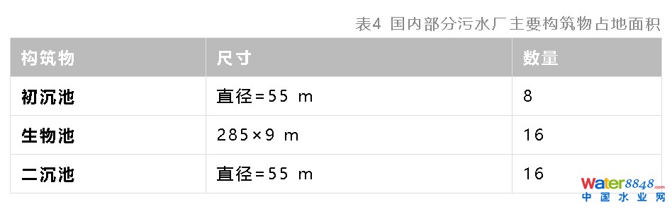 按照E20-327型光伏板性能、案例污水廠所在地的光照條件,單塊光伏板每天產生的能量約為1.09 kWh(單板占地面積為4.65 m2)。如果在案例污水廠主要構筑物平面(表4)上安裝E20-327型光伏板,可計算得其可回收的太陽能總量為82725 MJ/d,僅僅能滿足案例污水廠運行能耗的10.4%,即通過光伏發(fā)電可獲取的能量顯得有些“微不足道”!
