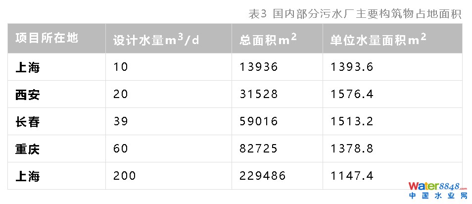 光伏發(fā)電可回收的能量多少主要取決于可用于安裝光伏板的面積大小。對于污水處理廠來說,各個處理單元的頂部均可用于光伏板的安裝,且面積較為可觀。為了解我國污水處理廠設計規(guī)范下可用的光伏板安裝面積,我們總結了處理規(guī)模不同的污水處理廠部分單元構筑物的面積,如表3所示。可知,我國污水處理廠處理單位萬噸污水對應的主要構筑物的平面面積在1147~1576 m2之間,平均值為1402 m2。由于規(guī)模效應的存在,這一數(shù)值是隨著處理水量的增大而減少的。